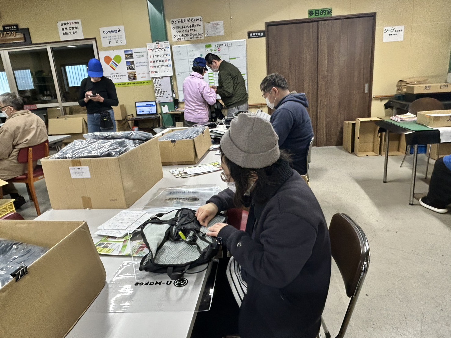 各作業場で行う毎日の作業スケジュールを、始業前に口頭で説 明してから作業に取り掛かるようにしました。連続した同一作業では集中力が続かない特性があるため、「動」と「静」の組み合わせと工夫して、企業との信頼関係のもと納期に間に合うように日々作業に励んでいます。